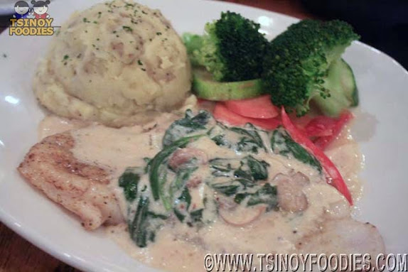 Grilled Fish Marsala is a grilled and seasoned fresh fish of the day (Dowry in this case) topped with spinach and button mushroom marsala sauce with your choice of side dish (Steamed Vegetables and Mashed Potatoes in this case). The dowry was grilled just right delivering softness that almost melts on your mouth.