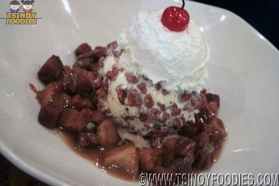 Cinnamon Oblivion is a big scoop of vanilla ice cream sprinkled all over by candied pecan bits topped with whipped cream and cherry and laid on a pool of caramel syrup with cinnamon crouton and apple cubes. It is Outback's extravagant version of a classic Apple Crumble Ala Mode. And, I promise you that this is one genuinely blissful sweet treat!