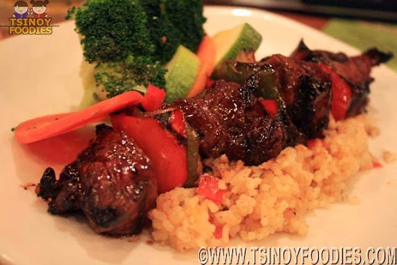 Teriyaki Beef Medallions. This fire-grilled medium-cooked steak chunk skewers with onions and red and green peppers marinated with subtly sweet teriyaki sauce was fantastic! It is laid on a bed of seasoned rice with your choice of side dish (Steamed Vegetables in this case)