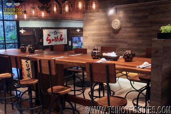 Aside from the wooden tone which gives a traditional Japanese ramen shop vibe, it fused well with the modern dangling lamps and other dangling kitchen utensils display.