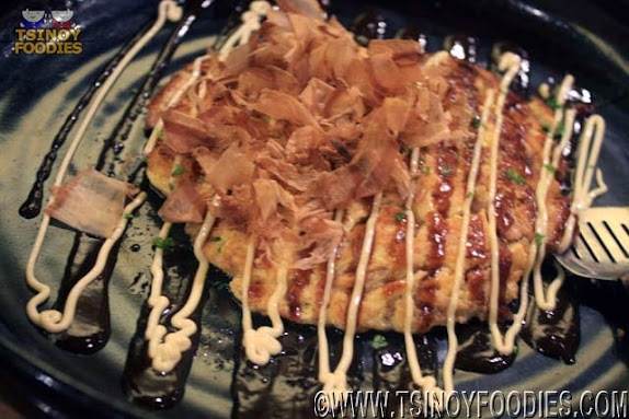 Tuna Omelet is the classic okonomiyaki (Japanese omelet) filled with canned tuna chunks and embellished by Worcestershire sauce, Japanese mayonnaise and bonito flakes. Flavor is alright but I'd prefer a fluffier version.