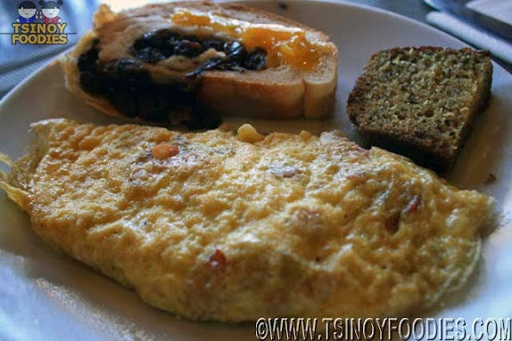 | Mushroom Omelet, Orange Marmalade and Blueberry Jam Smeared Raisin Bread and Banana Bread |