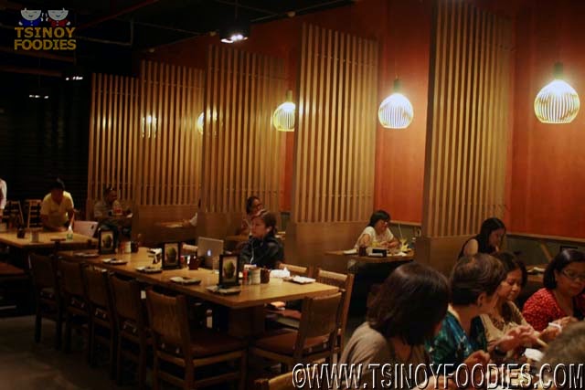 The interiors are of traditional Japanese with wooden tables, chairs and dividers. The entire place is lit with soft yellow lighting.