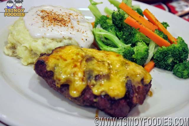 The Parmesan Chicken is a lean chunk of chicken breast topped with parmesan, Monterey Jack cheese and green onions which is grilled with chile butter to perfection making it juicy and tender. It also comes with choice of two sides.