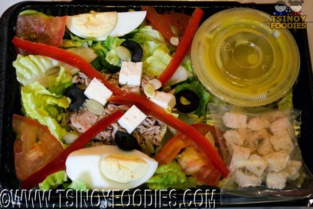 The Tuna Mediterranean Salad has the following listed ingredients: tuna, romaine lettuce, pumpkin seeds, white cheese, tomatoes, red bell pepper, olives, egg, croutons and citrus dressing. I'm actually curious on what the croutons are made of and how they manage to made that Gluten-Free. This is a lighter option than the Korean Beef Salad.