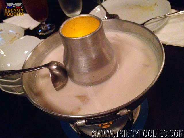 The dining area was huge! It had brick-colored walls with artistic steel framed mirrors. There were large Buddha figures. Each were holding flickering candles. It had a fountain in the center and many long tables covered in black linen sheets and big wooden and skillfully carved sturdy chairs.