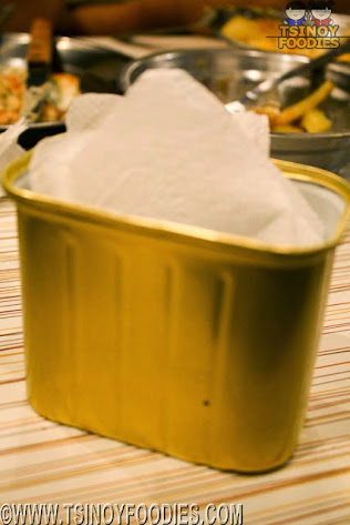 Each table has a recycled spam turned into a napkin holder...