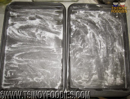 Step 2: were prepared by Place parchment paper over the 2 Cake pans (oil can be placed underneath to keep them in place) and dusting them with Confectioner's sugar.