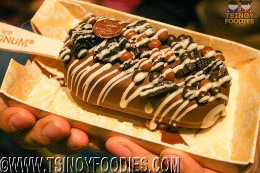 | Milk Chocolate Coating with White Chocolate Drizzle Topped with Crunched Oreos, Chocolate Crunch Balls and Caramel Crunch Balls Magnum Vanilla Ice Cream Bar (100 php) |