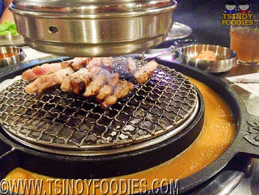 As soon as we ordered, we were served their complimentary brown rice tea. Then, our server sets our charcoal griller and fills up the sides with red bell peppers, onions, sweet corn with mozzarella cheese and raw egg. It's the first time we've encountered a griller designed like that. Later on, as the meats are grilled, the oil will spill on the sides adding flavor to them.
