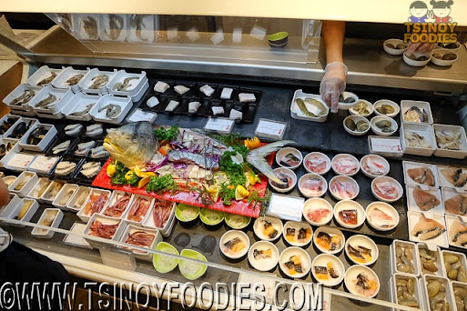 Unnoticeable to many, there a sushi bar with a chalk board label of Salmon Sashimi by the cooked dishes and the Fish Station where you can request for fresh slices of Salmon Sashimi.