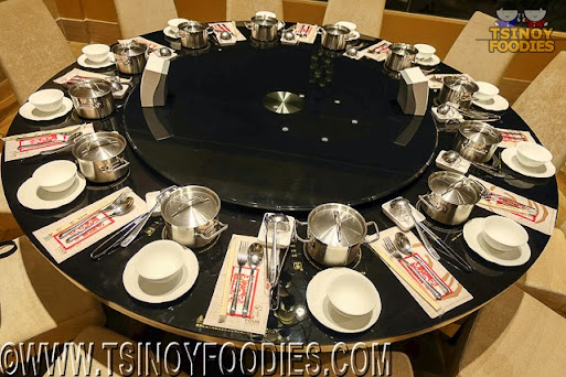 On the left side are the function rooms which they call VIP rooms. Fortunately, dear cousin booked us for VIP Table 4 and 5 which had a nice window view of the bay. But, what may the VIP tables cool is that we each had our own pot. This is quite convenient for me since I have seafood allergy. It's also more spacious! Believe me, our table is not this clear or organized as soon as we started. I'm not sure though if we had a space problem or a service problem since we found it difficult to call the attention of the servers to remove our empty plates. Some of them would affirm from our calls and then neglect us after. That didn't make us feel like VIPs... I wish they would also orient us on how to use the electric stove. We had to call for assistance to find out the pressing the power button twice would switch it on. Good thing too that it was in Chinese characters so we understood what was low, medium and high. Each table could seat 12 people. We're exactly 24 so we were able to avail of the big group promo and had 2 persons free.