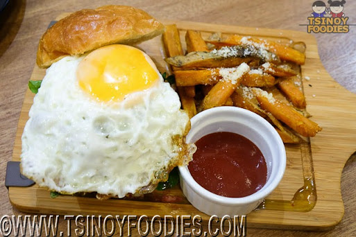 | Australian Grass-fed All Beef Burger with Australian Cheddar, Pickled Beets, Olive Oil Aoili and House-made Brioche Bun with Baked Sweet Potato Wedges with Egg (425 php) |