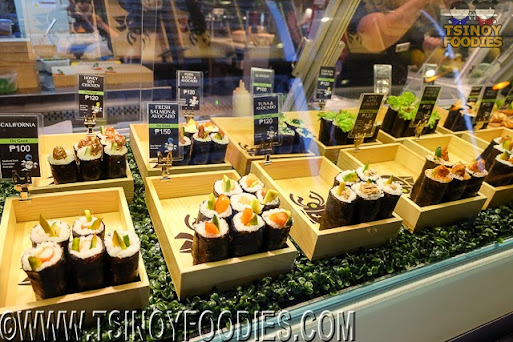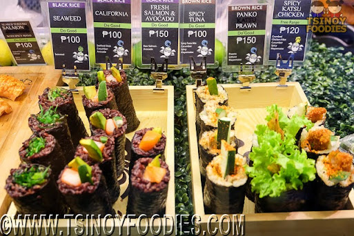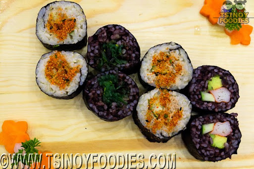 | Spicy Tuna (100 php), Black Rice Seaweed (100 php) and Black Rice California (100 php), |
