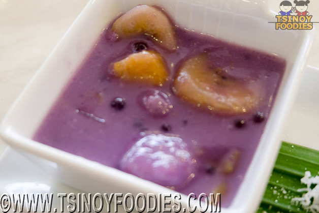 The Guinataang Halo-Halo is a coconut cream dessert soup tinted with the color of its main ingredient: purple yam, taro and sweet potato. To add the mellow sweetness that we love, there's plaintain banana and jackfruit slices. And, I'm glad there's my favorite chewy rice dumpling ball too.