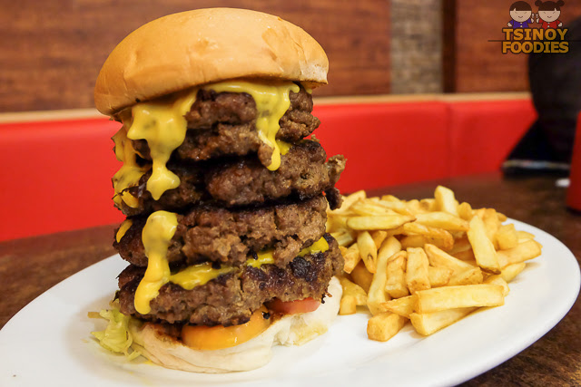 Really, when you have a burger craving like mine, such craving can be met by no other than the Tombstone Burger. Take a look at this two pound cheeseburger beauty: four juicy and greasy burger patties stacked and accentuated by the creamy cheese sauce.