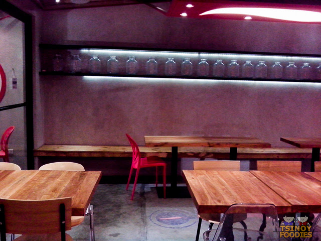 The interior is almost bare. On it's unfurnished cement walls are empty jars. There's hardly nothing to notice except for its wooden tables paired with an variations of chairs and...