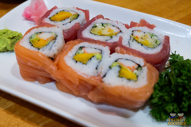 The Iradori Maki is a tuna and salmon california maki with mango and crabsticks.