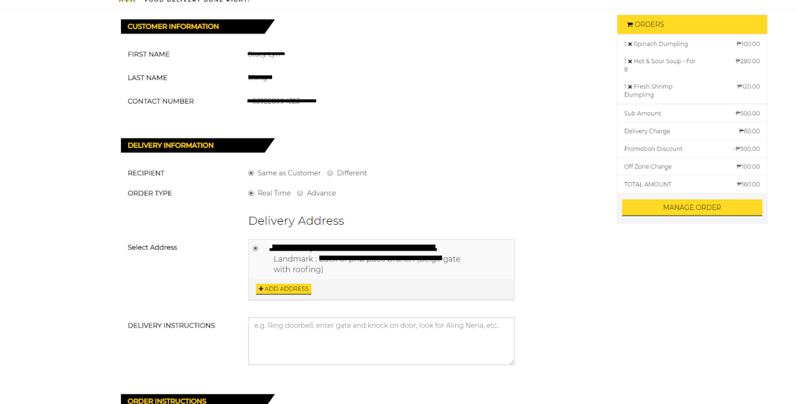 As you can see, my total bill is 660 php. My ordered food items is worth 500 php. The delivery charge from Makati to Manila is 160 php (basic of 60 php and Off Zone Charge of 100 php).