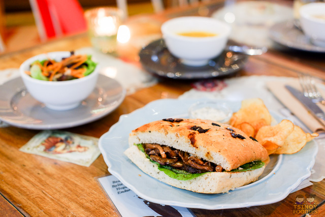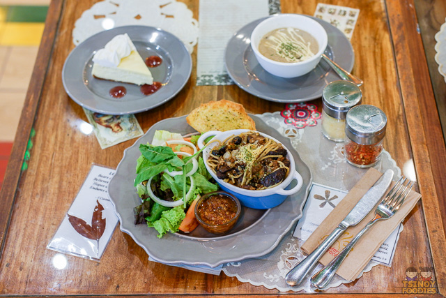 Vegetables on Focacia Sandwich served with homemade potato chips and garlic dip. Mary Grace really knows how to please a mushroom lovers heart. Look at how it was overloaded with shitake mushrooms! The sweet potato chips had an addictive garlic dip too. As with all Sandwiches and Flavorful Pastas, there was an add on option for side salad or half-serving from its Hearty Soups menu. We opted for the Summer Squash (89 php/add-on) this time and it was also so good.